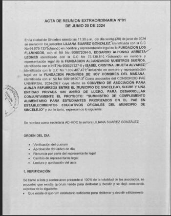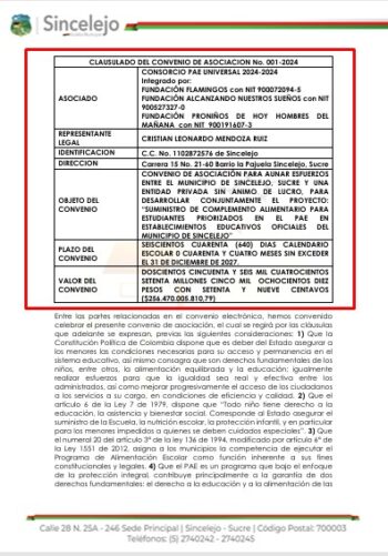 Tal es el caso, por un lado, del Convenio de Asociación No. 001-2024, celebrado entre el municipio de Sincelejo y el Consorcio PAE Universal 2024–2027, cuyo objeto es el “suministro de complemento alimentario para estudiantes de los establecimientos educativos oficiales del municipio de Sincelejo”. Dicho convenio fue suscrito por un valor de $256.470 millones de pesos, con un plazo de 4 años y el compromiso de vigencias futuras con cargo a recursos propios del ente territorial.