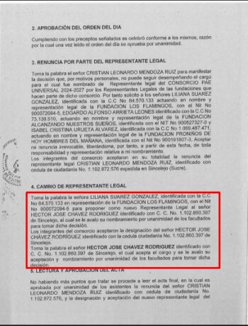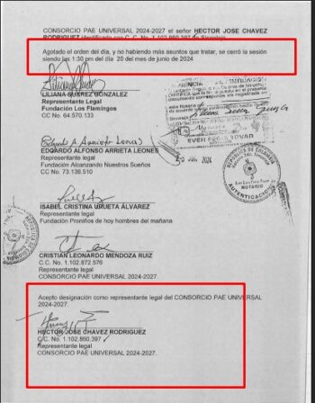 Por otra parte, entre el 2 de febrero y el 12 de junio de 2025, período en el que Chávez Rodríguez ejercía como representante legal del Consorcio PAE Universal 2024–2027, también fungía —como un verdadero “todoterreno”— como representante legal del Consorcio Solución Vial Sincelejo.