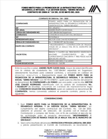 Por otro lado, el Contrato de Obra No. 124-2025, celebrado entre el Fondo Mixto “Sierra Nevada” —en calidad de órgano ejecutor delegado por el municipio de Sincelejo— y el Consorcio Solución Vial Sincelejo, que tiene por objeto el “mejoramiento y construcción de tramos viales de la malla vial en el municipio de Sincelejo”. Este contrato fue suscrito por un valor de $34.325 millones de pesos, con un plazo de 10 años y el compromiso de vigencias futuras con cargo a recursos del Sistema General de Regalías.