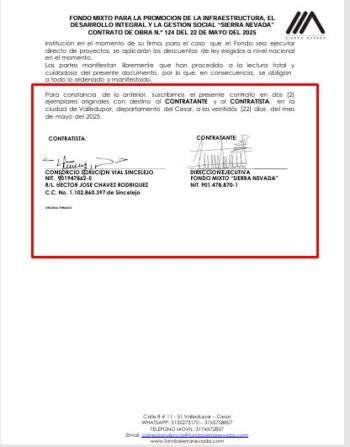 En consecuencia, el 22 de mayo de 2025, el señor Héctor José Chávez Rodríguez, siendo aún representante legal en ejercicio del Consorcio PAE Universal 2024–2027, suscribió simultáneamente el Contrato de Obra No. 124-2025 con el Fondo Mixto “Sierra Nevada” como representante legal del Consorcio Solución Vial Sincelejo, para ejecutar $34.325 millones de pesos en un plazo de 10 años, de los cuales ya recibió un anticipo del 25% del valor del contrato.