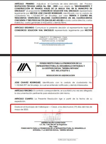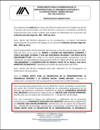 Mediante la Resolución No. 045 del 19 de mayo de 2025, se adjudicó el contrato derivado de dicho proceso, al que se presentaron tres oferentes. Sin embargo, “como era obvio”, el comité evaluador —o más bien, adulador— habilitó la propuesta del Consorcio Solución Vial Sincelejo, representado por Chávez Rodríguez, por “cumplir” todos los requisitos establecidos en los términos de referencia.