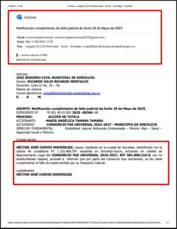 Así ocurrió en el Juzgado Segundo Civil Municipal de Sincelejo, dentro de la acción de tutela radicada bajo el No. 2025-00266-00, interpuesta por la señora María Angélica Tamara contra el Consorcio PAE Universal 2024–2027 por violación al derecho fundamental de petición y a la estabilidad laboral reforzada, tras ser despedida en estado de embarazo. En dicho proceso se constató que Chávez Rodríguez presentó un memorial de cumplimiento de sentencia mediante correo electrónico fechado el 12 de junio de 2025, lo que confirma que, a la fecha, continúa ejerciendo activamente sus funciones.