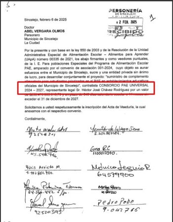 Sin embargo, el común denominador más preocupante es que ambas entidades contratistas —Consorcio PAE Universal 2024–2027 y Consorcio Solución Vial Sincelejo— tienen como representante legal a una misma persona: el señor Héctor José Chávez Rodríguez.